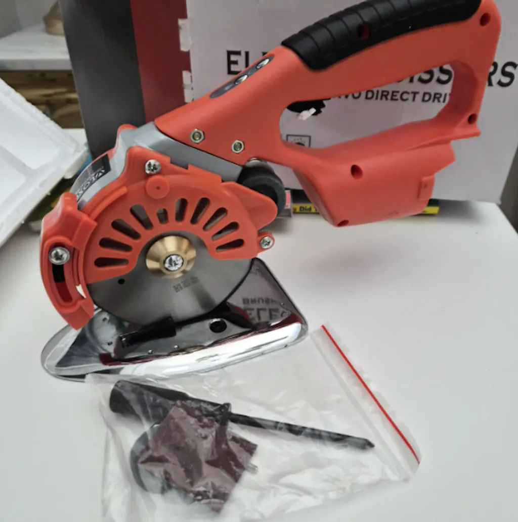 Cuts through fabric, leather, and carpet easily, and the adjustable speed is really handy. The battery lasts long, and having a spare is great. The blades stay sharp thanks to the self-sharpening system. Makes cutting so much faster and easier than using regular scissors.